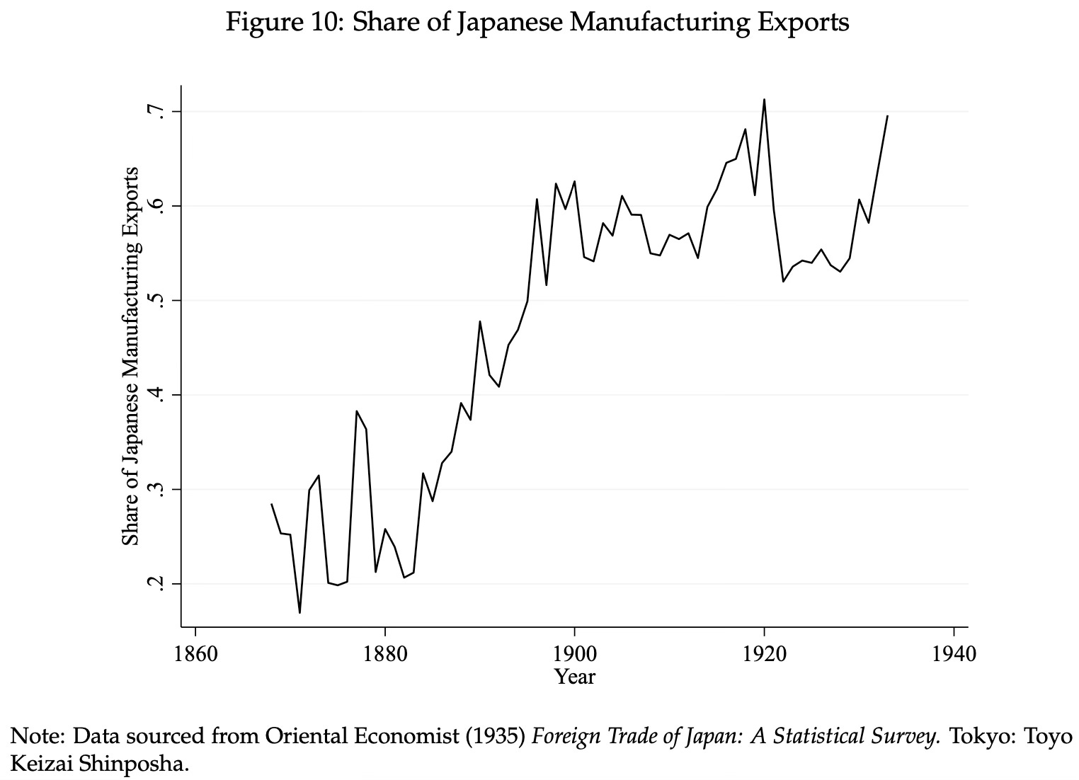 To avoid the risk of reductionism with the interpretation of such research, I’ll argue that the diffusion of technical literacy allowed the Japanese to make good use of the investments made during the Meiji reform period in the development of institutions, infrastructure, financial markets, and in the promotion of domestic firms and trade facilitation. Without the latter, technical literacy alone would have achieved little. Technical literacy built on the foundations laid by the main Meiji era investments and reforms and delivered Japan’s spectacular industrial transformation in a short period.