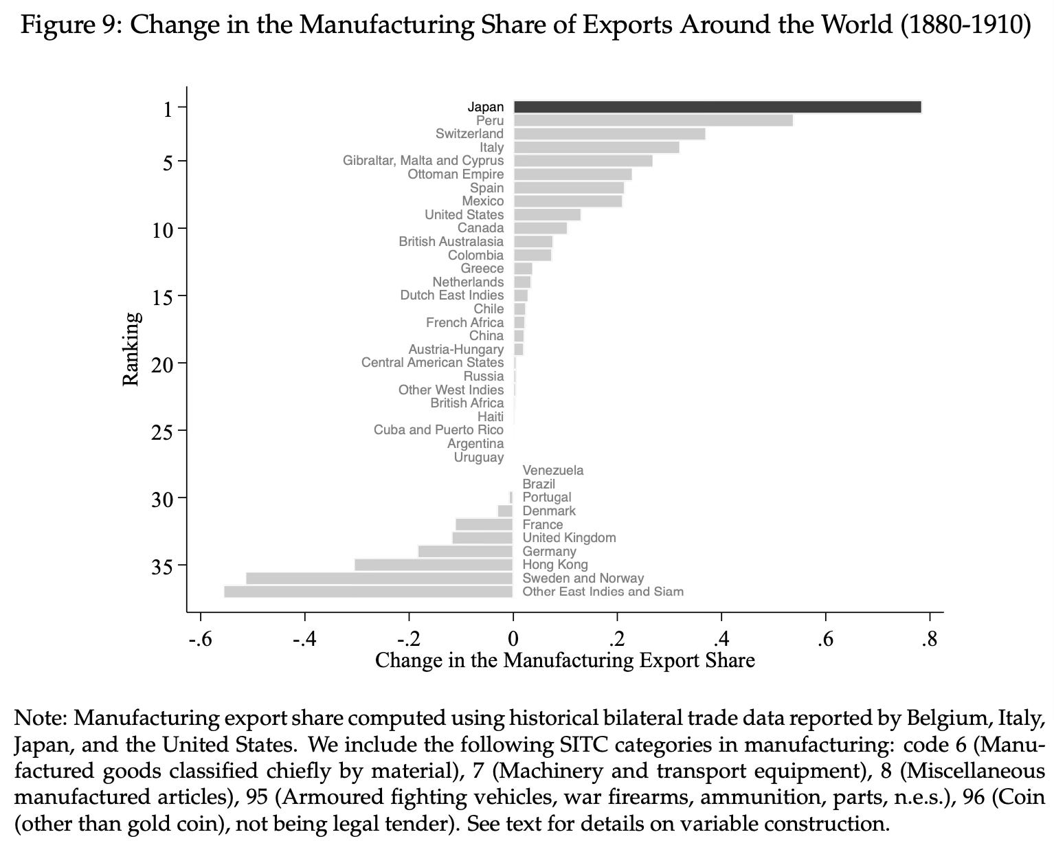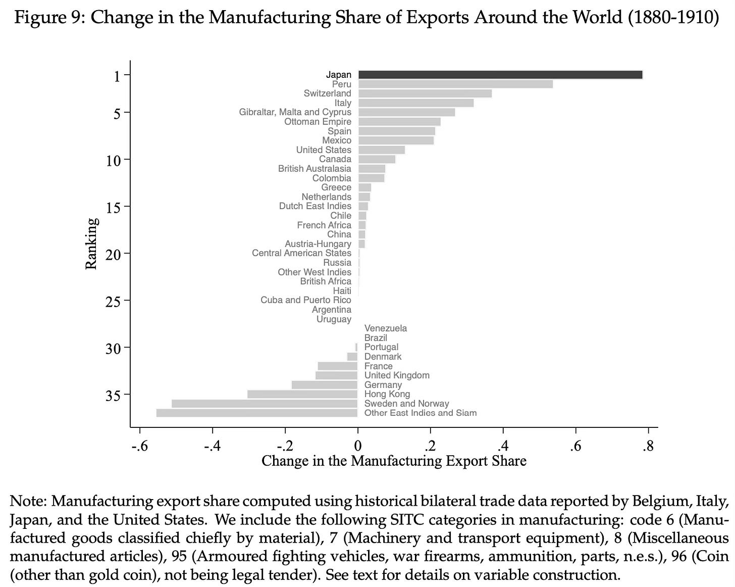 Our results point to the importance of certain public goods necessary for industrialization. These results are particularly helpful in placing the “Meiji Miracle” in a comparative perspective. That is, while the more standard modernization efforts of the Meiji government, such as the introduction of banking and railroads, certainly contributed to industrialization, given their fairly widespread adoption in other parts of the global periphery, which were characterized by more modest growth, it is unlikely they can give a full account. In contrast, our paper provides empirical support for the long strand of Japanese economic history that has emphasized the more unique aspects of the Japanese government’s efforts to adopt Western technology. In fact, our results suggest that the Japanese state may have been uniquely successful in relaxing key constraints to adopting Western technology…