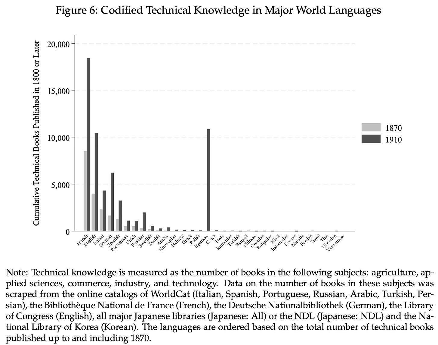 Furthermore, we only find a relationship between productivity growth and the supply of technical knowledge in countries that codified technical knowledge, consistent with our mechanism. This lends support to the idea that broad access to technical knowledge, which at the time usually meant access in the vernacular if people spoke a vernacular that was linguistically distant from English, was a necessary condition for the diffusion of Industrial Revolution technologies and manufacturing growth more broadly. Moreover, our results suggest that for regions outside of Western Europe, the codification of technical knowledge was a complex public good that required state provision… Japan succeeded in producing many technical translations.